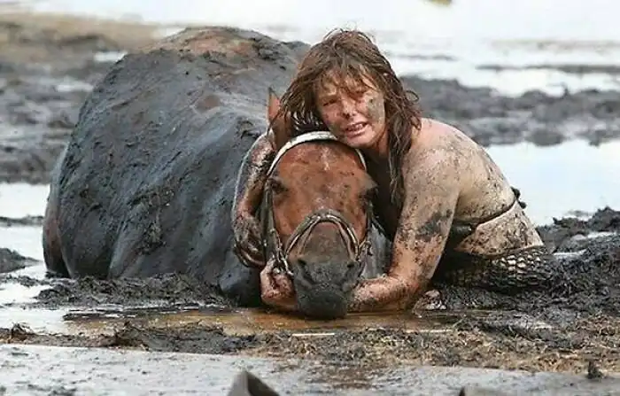 21. Эта лошадь увязла в грязи. Ее хозяйка, Николь Грэм, в течение трех часов удерживала ее голову, чтобы она не захлебнулась, пока им не пришли на помощь.