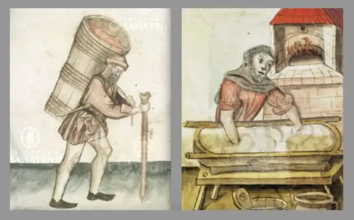 Кувшин напоминает нам о такой благородной древней профессии, как сборщик мочи. Ведь ценнейший аммиак использовался не только в прачечном деле. Его постоянными потребителями были кожевенные мастерские. Аммиачный раствор растворял жир, облегчал удаление с кож остатков мяса и волос. Перед покраской тканей их тоже обрабатывали аммиачным раствором, это делало окрашиваемые ткани ярче. Вот почему каждое утро выходили на "охоту" сборщики мочи – по домам и тавернам собирали ценное сырьё и разносили его по разным мастерским.