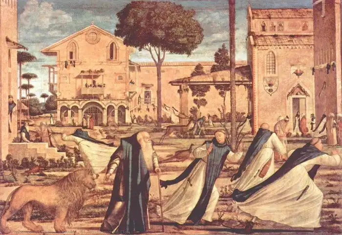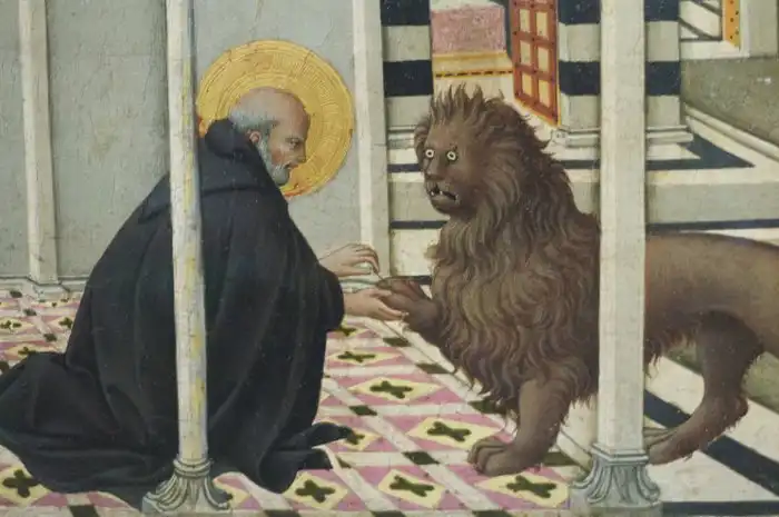 С этим львом связана вот какая история. Рассказывали, будто однажды в окрестностях монастыря, где жил и работал Иероним, появился лев. Что ему было надо, непонятно, так что монахи на всякий случай разбежались, и только Иероним заметил, что лев хромает и нуждается в помощи. Он вынул из лапы хищника занозу и поделился с ним своей скудной пищей (ведь охотиться лев не мог и порядком отощал).
