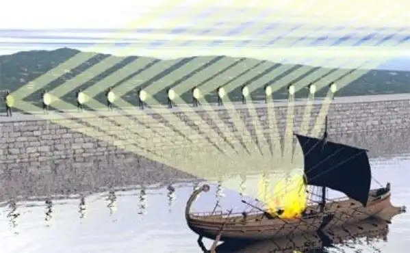 Версия была поддержана историком Галеном (130-200 гг.), который поведал о сложной комбинации зеркал, работающих аналогом увеличительного стекла, фокусируя солнечные лучи на противнике.