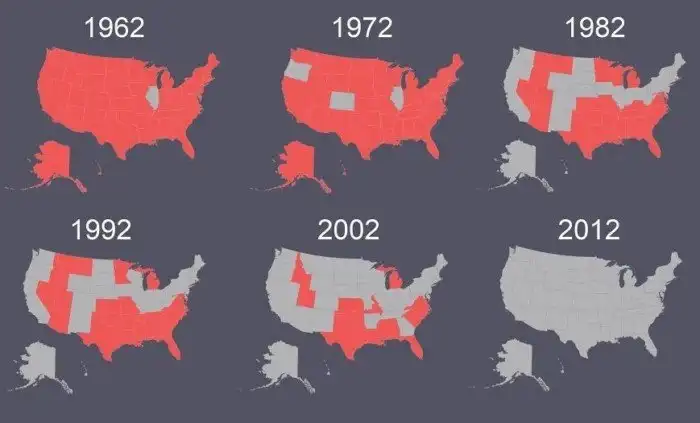 22. Красным цветом отмечены штаты США, в которых гомосексуальность была вне закона, с 1962 по 2012 год