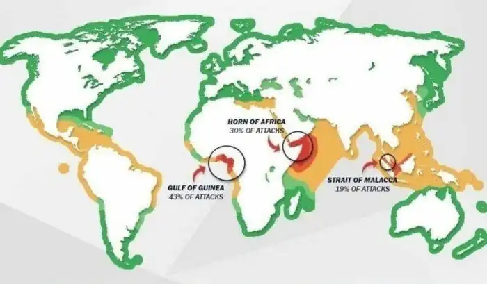 Район Сомали (полуостров Африканский рог) - 30% атак пиратов, Гвинейский залив - 43% атак, Малаккский пролив - 19% атак.
