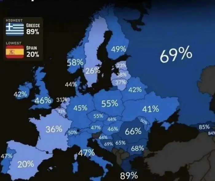 Самый высокий показатель в Греции, самый низкий в Испании.
