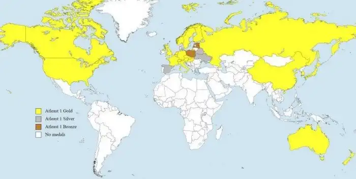 Желтый цвет - минимум одно золото, серый - минимум одно серебро, коричневый - минимум одна бронза.