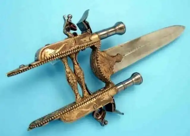 Пистолет с клинком. Когда не все попытки разработать эффективное и надежное ручное огнестрельное оружие заканчивались успешно, было принято решение совмещать «огнестрел» с привычным холодным оружием. Так появился и пистолет-клинок — к клинкам попросту приделывали пистолетные механизмы.