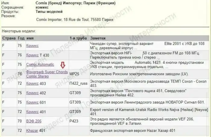 Только на заводе ВЭФ не замаривались с названием: просто к номеру модели дописывали VEGA, если поставка шла в Англию или COMIX , если поставлялось во Францию.