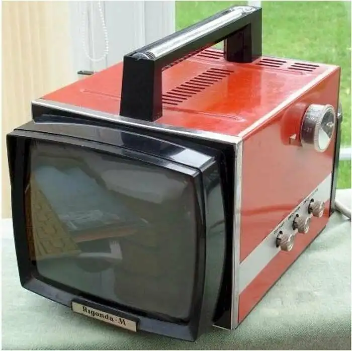 В телевизоре "RIGONDA-M" можно угадать советский переносной "Электроника-ВЛ 100", который выпускали с 1969 года. Номер модели расшифровывается как "100 лет со дня рождения Владимира Ленина"