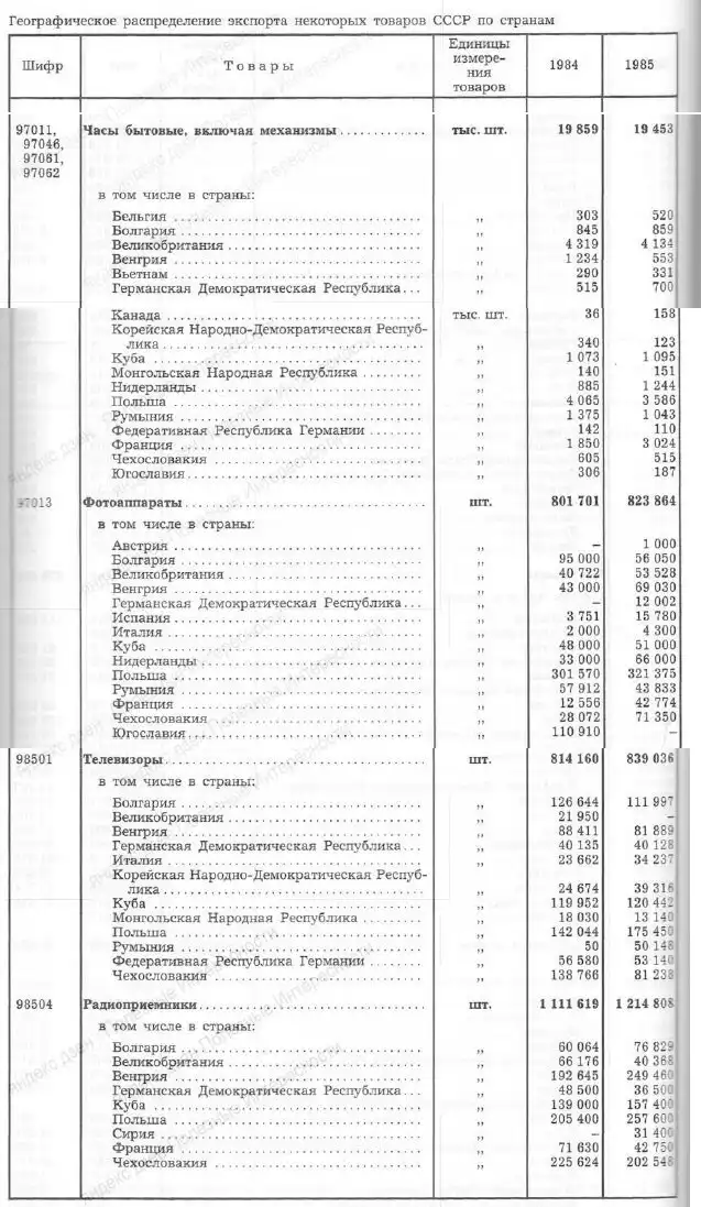 Внешнеэкономическое объединение "Машприборинторг" замечательно организовало работу зарубежных подразделений. У меня есть справочник 1985 года по внешнеэкономическим операциям. Вот какую бытовую аппаратуру поставлял СССР по странам мире в тот год: