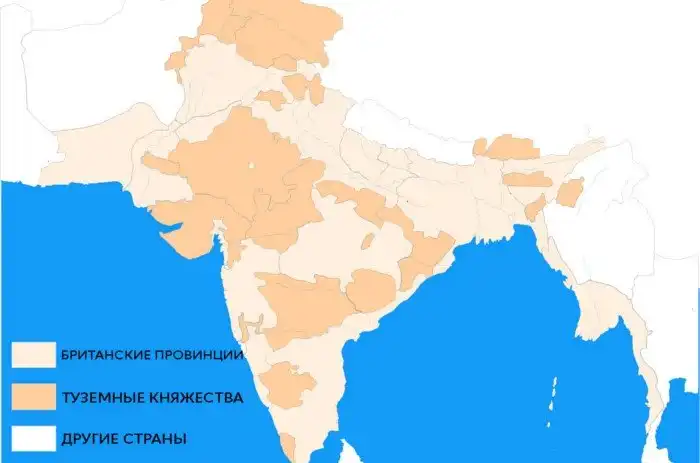 Формально, более 60% индийской территории вошла в империю на правах вассальных княжеств и сохранила автономию. Однако британцы контролировали политику и торговлю марионеточных государств и держали все важные государственные посты. Колониальная армия подавляла все восстания против европейского владычества.