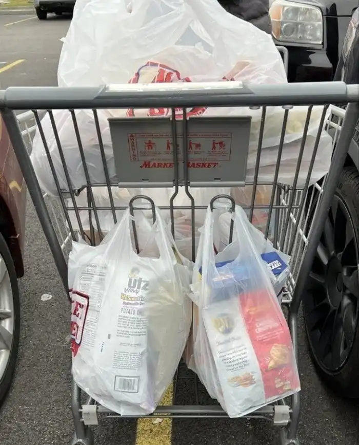 3. "Я понятия не имел, что так можно, хотя уже 45 лет хожу по магазинам. Если пакеты не помещаются или в них что-то хрупкое, их можно повесить на заднюю часть тележки"