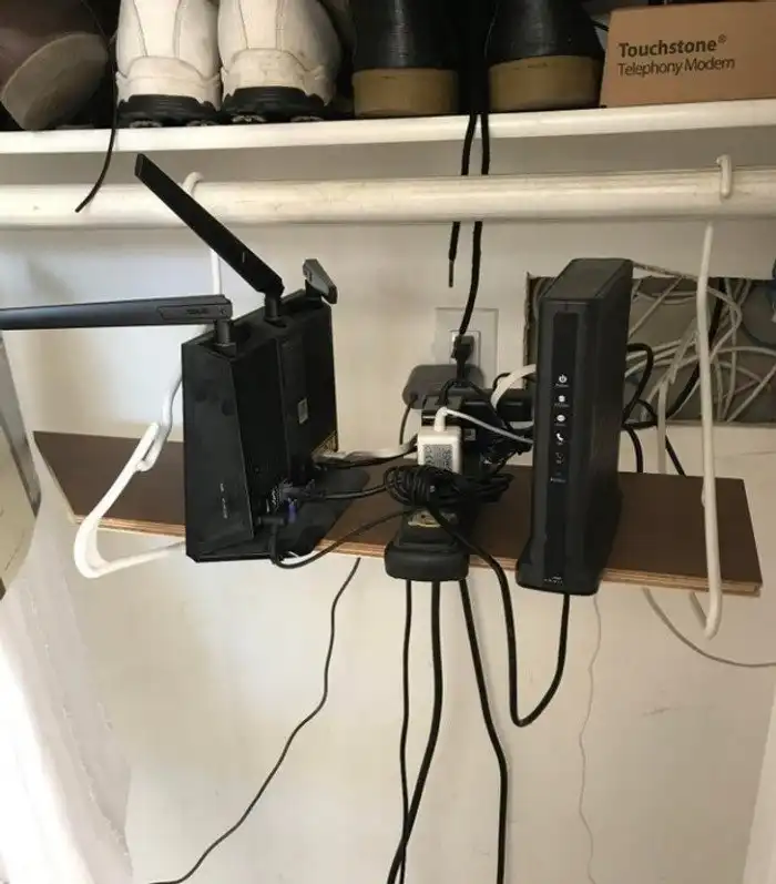 10. "Мои родители сделали временную полочку из 2-х вешалок для одежды и обрезка доски"