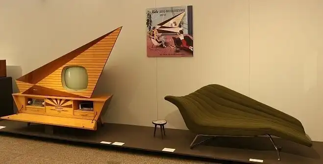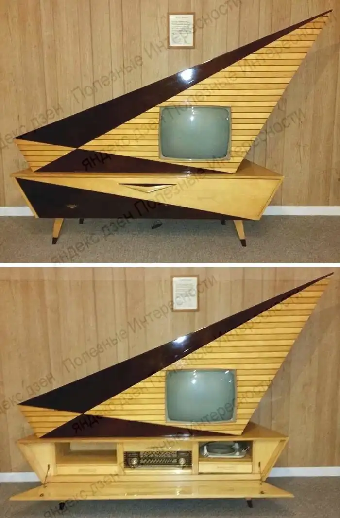 Понимая, что такую тяжесть даже с места сдвинуть проблема, корпус сделали сборной из двух частей. В нижней части разместили проигрыватель с автоматической подачей пластинок и радиоприемник. Там же находится блок электропитания. В верхней части, стилизованной под парус, встроили телевизор и акустику. Конструкция позволяет верхнюю часть поворачивать в довольно широких пределах.