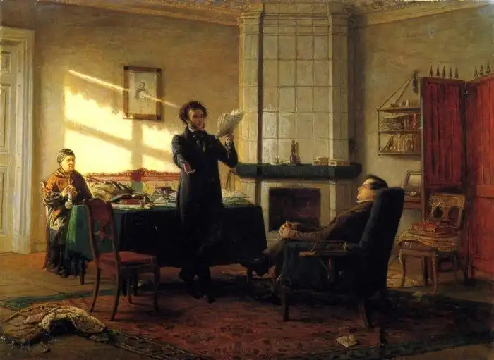 На картине Николая Николаевича Ге «Пушкин в Михайловском» поэт читает стихи своему лицейскому другу Ивану Пущину. Тут же сидит с вязанием знаменитая «няня Пушкина» – Арина Родионовна Матвеева… Почему в кавычках? Потому что на самом деле няней маленького Пушкина была другая женщина – недавно мы об этом рассказывали.