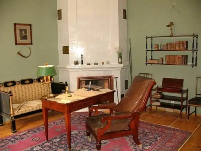 Но дело не этом. Дело в том, что это... вообще не кабинет Пушкина! На знаменитой картине изображён кабинет его младшего сына, Григория Александровича, жившего в отцовском доме в Михайловском... Так вот. Ближе к помадным банкам.