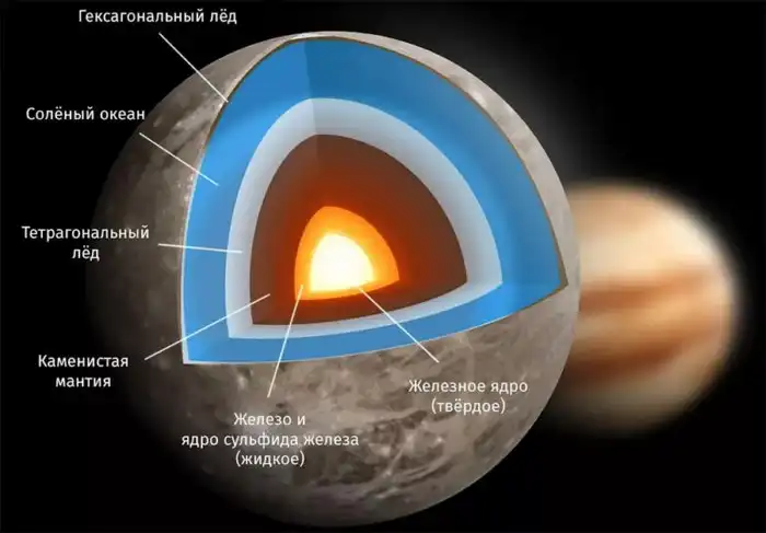 Льда на Ганимеде вообще очень много. Согласно подсчётам учёных, спутник примерно на 46 – 50% состоит из водяного льда.