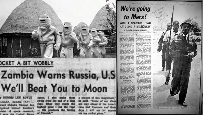 Слева – статья из газеты, в которой Замбия обещает опередить СССР на Луне (иллюстрация к статье – фотоколлаж). Справа – статья Макуки Нколосы, посвященная "марсианской программе"
