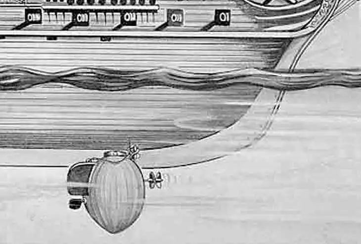 Итак, подводное судно, своим видом больше напоминавшее здоровенный бочонок, было изготовлено из дерева, вмещало одного оператора и оснащалось ручным приводом. Подводное положение поддерживалось с помощью свинцового балласта.