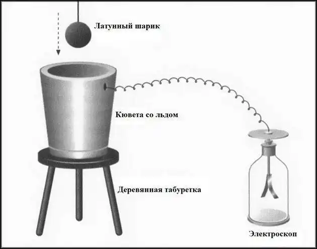 В этом случае отрицательно заряженный металлический шар опускался в емкость, не имевшую заряда. В результате электроны в ведре перестроились – положительно заряженные частицы оказались внутри него, а «минусовые» сконцентрировались снаружи. После того как шар изнутри прикоснулся к стенке, внутренние заряды уравновесились, а внешний отрицательный остался.