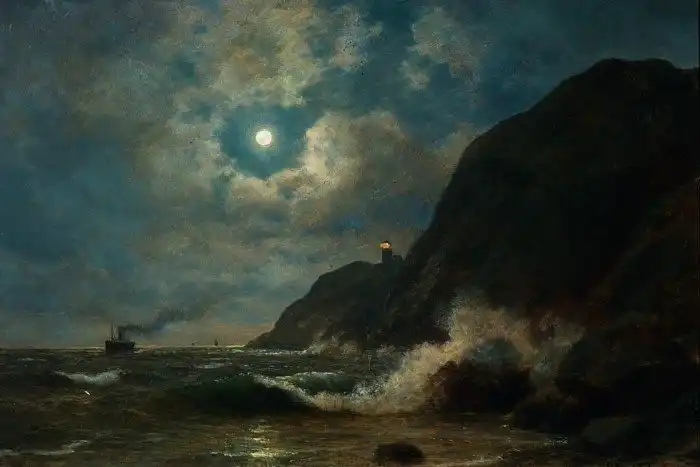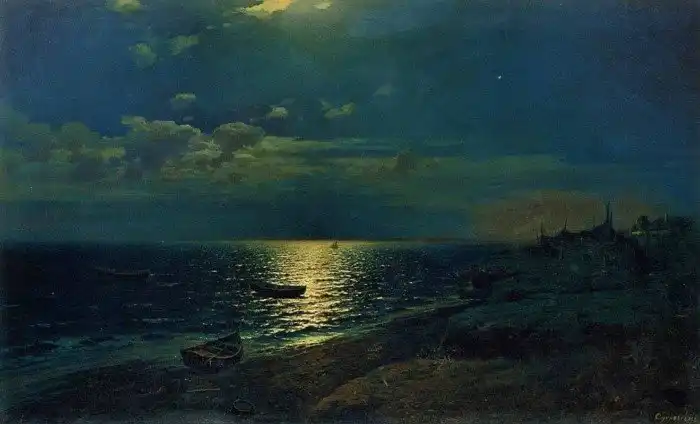 Эта же картина послужила поводом для скандала 1883 года. Когда она создавалась Куинджи, его соседом по квартире был как раз Руфин Судковский. Художники тогда приятельствовали. Лет через десять Судковский представил на суд зрителей полотно «Мёртвый штиль». И на ней тоже звучал мотив каменей, просвечивающих сквозь воду.