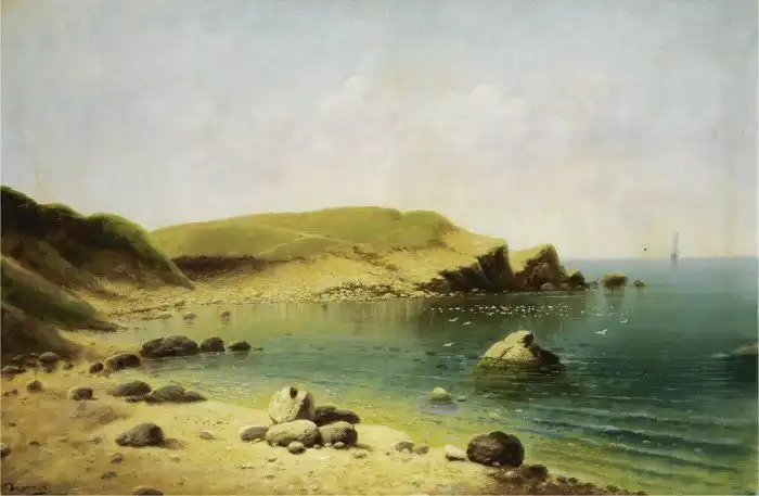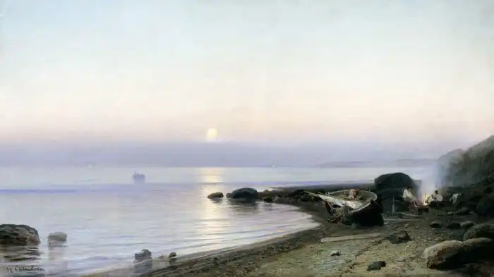 Так полотно датского пейзажиста Георга Эмиля Либерта, написанное в 1858 году (заметьте, Судковскому тогда лишь восемь лет!), в руках мошенников утратило рыбачьи домики, слегка изменило прибрежные камни на первом плане… И появился якобы пейзаж Судковского с типичным для него названием «Берег моря»: