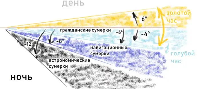 Если высота Солнца составляет от минус 6 до минус 12 градусов, наступают вторые, или навигационные сумерки. Небо уже ощутимо темнеет, зажигаются фонари на улицах и во дворах. Почему эти сумерки «навигационные»? Потому что в небе загораются яркие звёзды – навигационные звёзды, по которым моряки могут определять координаты корабля. Однако ещё достаточно светло, чтобы чётко видеть линию горизонта. Навигационные сумерки – самое рабочее время для корабельного штурмана, даже в наши времена спутниковых навигаторов и прочей умной электроники. Цвет неба – синий.