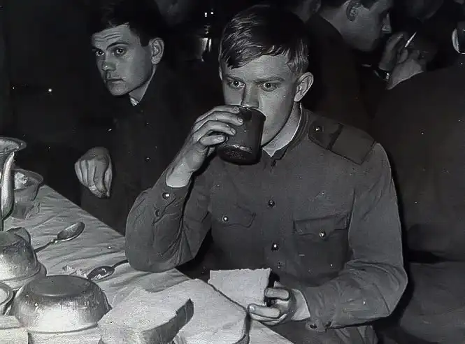 Сами солдатские столовые выглядели весьма обыкновенно, а вот подаваемая еда удивляла с первого взгляда. На типичном завтраке на выбор срочнику предлагалась каша, картофельное пюре и порция мяса. К основному блюду давался кусок хлеба, маленькая шайба сливочного масла и наливался весьма разбавленный чай.