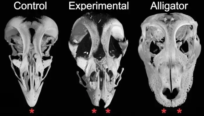 Слева череп зародыша курицы справа череп зародыша аллигатора в середине череп генно модифицированного зародыша с рылом вместо клюва