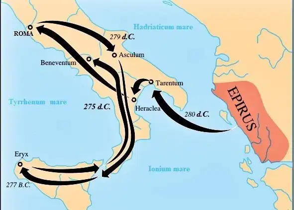 Тарентийцы обратились за помощью к Пирру. Собрав 25-тысячное войско, эпирский царь высадился в Италии, чтобы принудить Сенат к миру. За 5 лет между Римом и Эпиром развернулось три масштабных сражения, во всех столкновениях фаланги Пирра одержали победу над италийскими легионами.