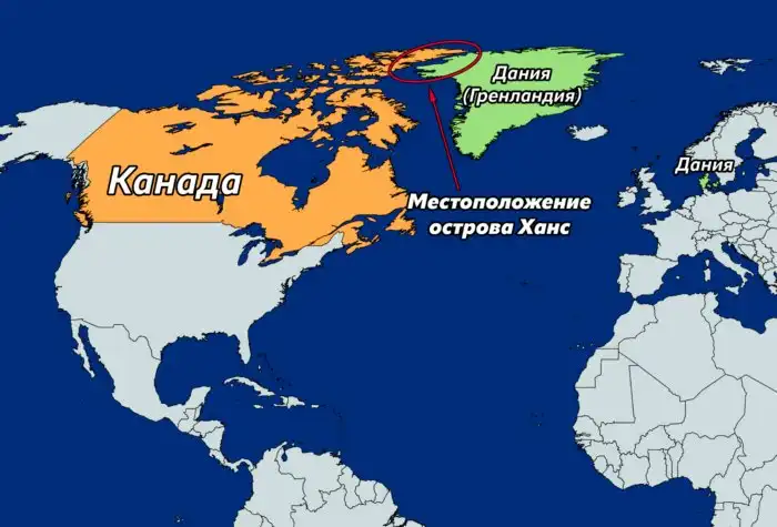 В основе конфликта лежит тот факт, что Ханс расположен прямо по середине пролива. Он одинаково удален от побережья Гренландии (принадлежит Дании) и от границ Канады. Поэтому, по международным правилам, на него может законно претендовать каждая сторона.