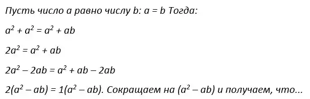 Допустим, нам надо доказать, что 1 = 2. Пожалуйста, вот доказательство: