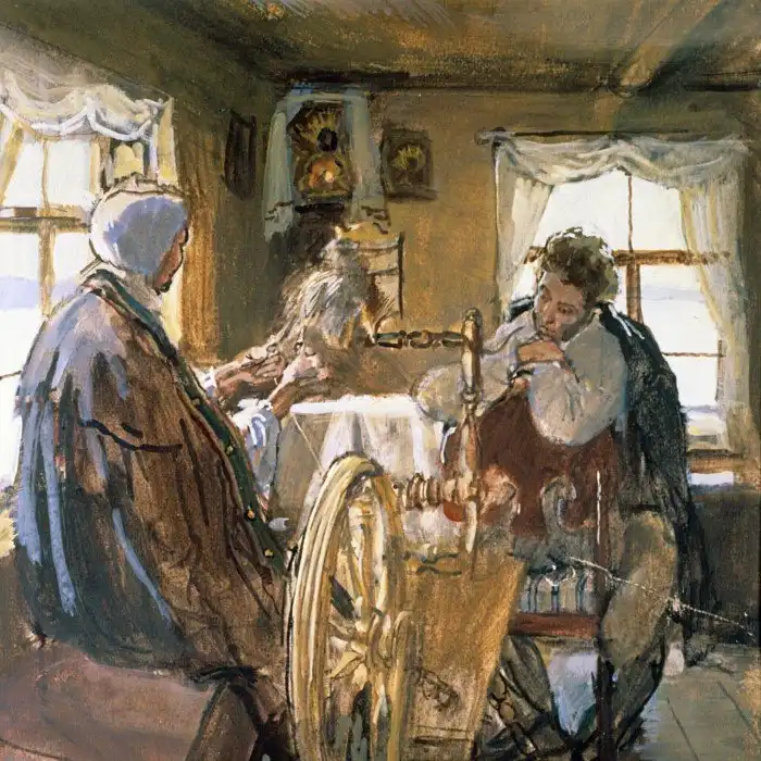 В глухой деревне от хандры Пушкина спасало только общение с няней, ведь Арина Родионовна была единственным человеком, которая была там с ним в ссылке. Долгими зимними вечерами она рассказывала Пушкину сказки, которые знала из детства. Те самые, которые поэт, пропустив через свое восприятие, подарил миру.
