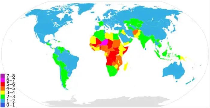 Сейчас практически все страны, так или иначе, преодолели эту ловушку. Вот так выглядит карта мира по числу детей, рожденных в расчете на одну женщину: