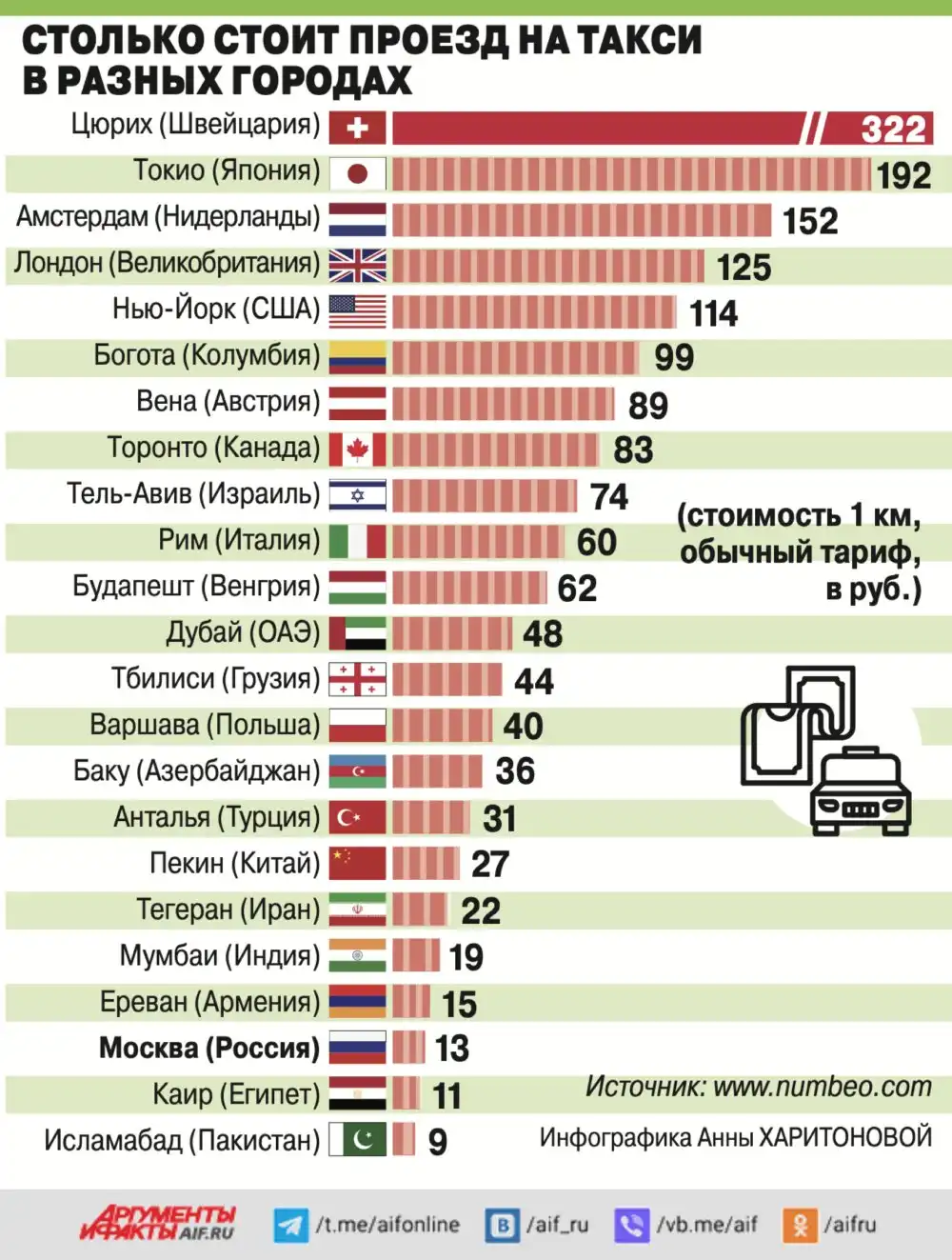 Столько стоит проезд на такси в разных городах мира.