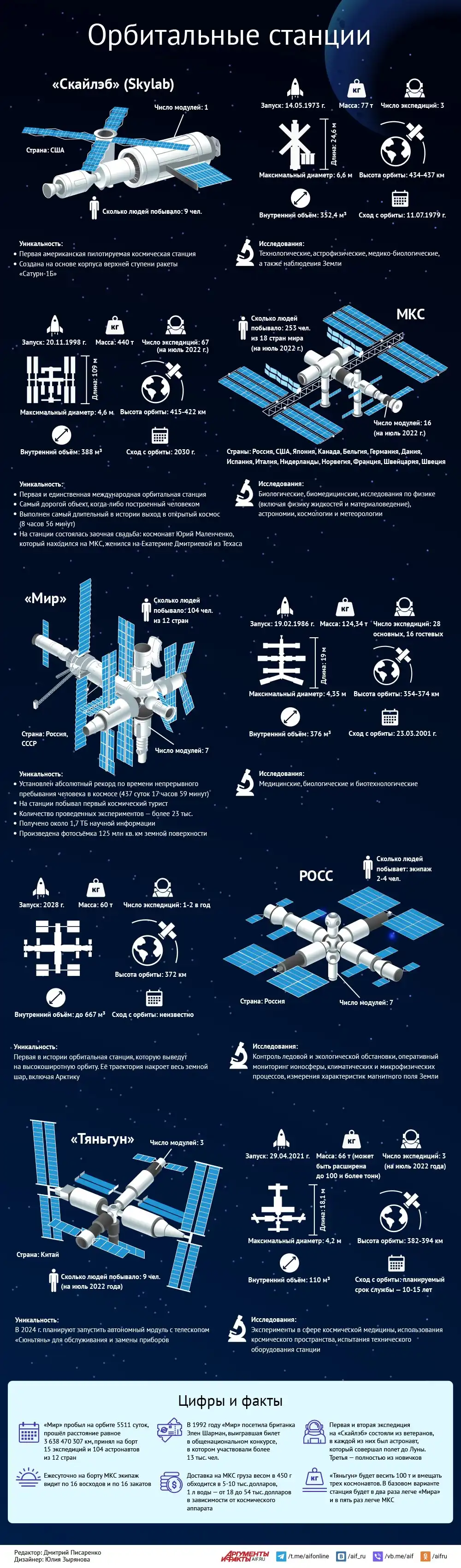 Прошлые, настоящие и будущие орбитальные станции СССР, России, США, Китая и других стран.