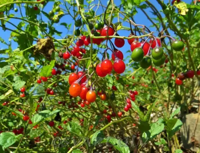 Может показаться, что это ветка томатов черри, однако это паслен сладко-горький. Пробовать его не стоит, поскольку он ядовит и опасен для человека.