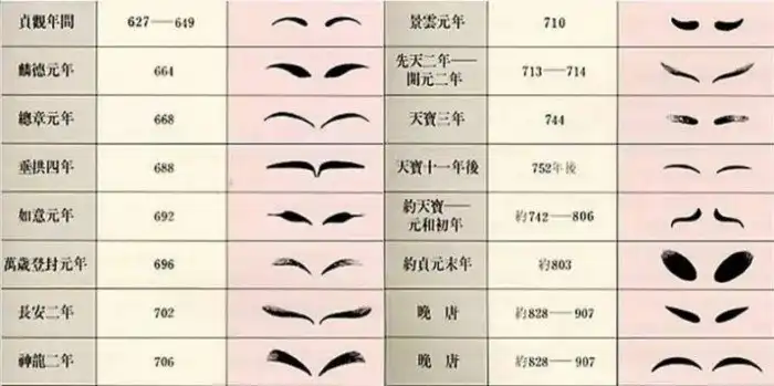 В Китае было принято выщипывать брови и рисовать на их месте новые. В моде были редкие формы: полностью круглые или прямые. У каждого вида бровей было какое-то поэтическое название: “дальние холмы“, ”ивовые листья” или “усики шелкопряда”. В то же время в разные эпохи существовала мода на разные брови, как и в наши дни.