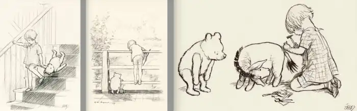 А нарисовал книжного Кристофера Робина художник Эрнест Шепард. На иллюстрациях мы видим премилого светловолосого ребёнка пяти или шести лет в летнем костюмчике.