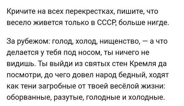 Предлагает адресату выйти из Кремля и посмотреть, как живут простые советские люди и прекратить врать про нищую Европу.