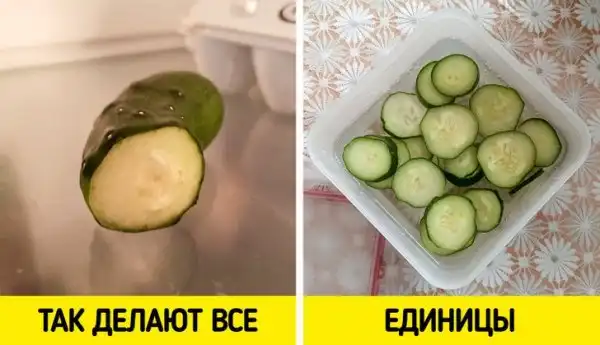 Если вы готовили овощную нарезку к обеду или ужину и у вас остались ломтики огурцов, следует убрать их в воду. Возьмите контейнер с крышкой, наполните его жидкостью и поместите туда нарезанные плоды. Так они сохранят свои хрустящие свойства к следующему приему пищи, поскольку будут лишены взаимодействия с воздухом.