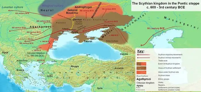 Греческий историк Геродот писал, что скифы первоначально населяли Азию, но были оттеснены на запад враждебными племенами. Они достигли Причерноморья и восточных окраин Европы, где, в свою очередь, уже сами вытеснили местных жителей.