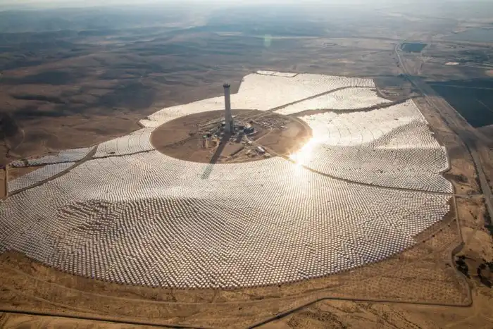 Постоянно светящее солнце пустыни позволяет внутри бойлера создать пар температурой до 600 градусов. Перегретым паром под высоким давлением крутится турбина, которая уже и вырабатывает электричество.