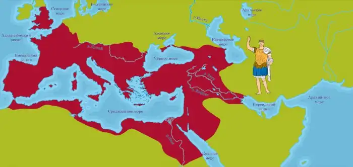 Наивысшего могущества римское государство достигло около 114 года нашей эры, во времена принцепса (императора) Траяна. Свыше 5000 километров с запада на восток, почти 3000 километров с севера на юг, многомиллионное население, мощная и эффективная армия, богатейшая казна, умелое государственное управление, искусство, строительство, культура. Водопровод, канализация, каменные многоэтажные дома (даже с «тёплыми полами»!), общественные бани, бассейны, прекрасные дороги, эффективное сельское хозяйство, процветающая торговля, театр, цирк, библиотеки.