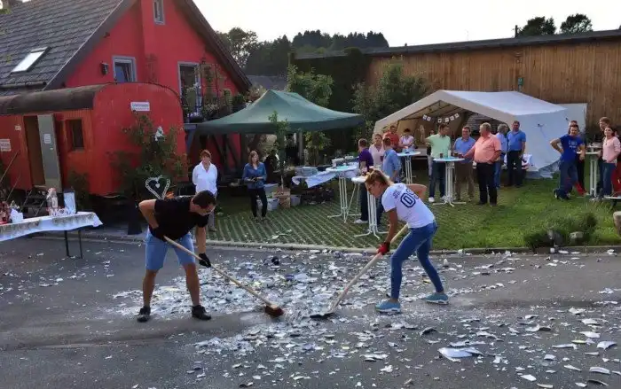 Эта вечеринка проводится женихом и невестой в Германии, за несколько дней до свадьбы. В этот вечер каждый гость, пришедший пожелать молодым людям счастья, должен разбить в специально отведенном месте керамическую или фарфоровую посуду. Шутники в семье приносят и разбивают старые керамические унитазы.