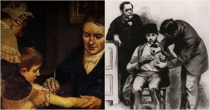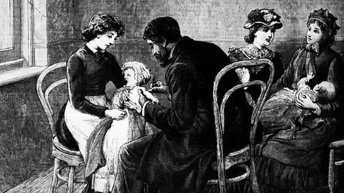 Однако, при передаче "из рук в руки" могли переноситься и остальные заболевания, где требовалось иное решение проблемы. Его нашёл английский врач Эдвард Дженнер, который в 1796 году сделал прививку от вируса коровьей оспы восьмилетнему Джеймсу Фиппсу. Врача немедленно раскритиковали: недоверие к медицине и науке. Вакцину даже объявили "нехристианской", так как произошла от коров. Распространяли слухи, что в вакцине Дженнера содержится "яд гадюки, кровь, внутренности и экскременты летучих мышей, жаб и слепых щенят". Ну только крови невинно убиенных младенцев не хватило. Прививки объявили вызовом Божьей воле, а учреждения, где ставили прививки от оспы революционными и еретическими.