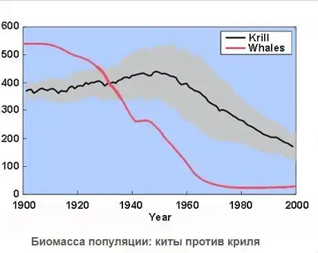 На графике черная линия - криль, красная - киты. По шкале Y - гигатонны биомассы.