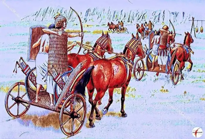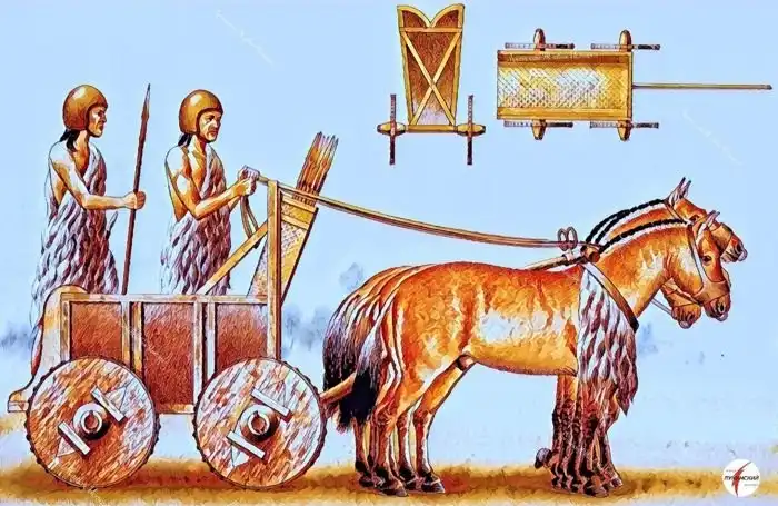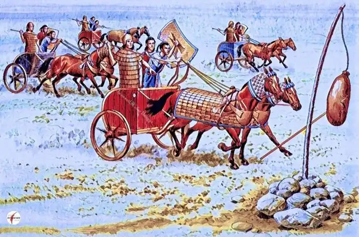 Боевые телеги станут колесницами 3900 лет назад, когда в Месопотамии изобретут технологию гнутья древесины. Легкие колеса со спицами и гнутые корпуса снизят вес и сделают производство более тонким. Путь боевым колесницам будет открыт и миру явится совершенная колесница Древнего Египта.