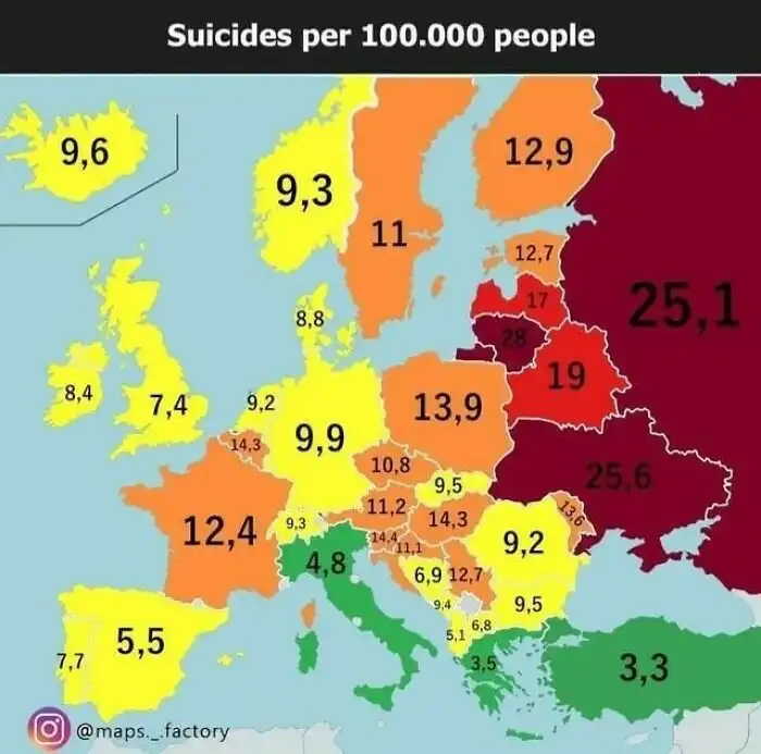3. Самоубийства в Европе в 2018 году (на 100 000 человек)