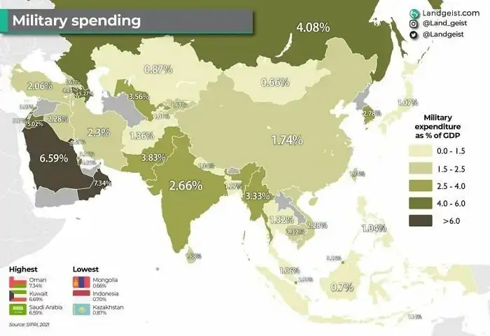 23. Сколько азиатские страны тратят на свои вооруженные силы (военные расходы в процентах от ВВП)