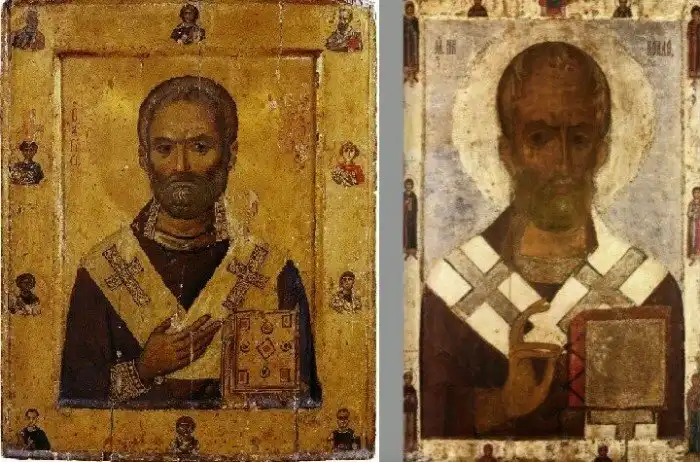Они успели. Николай останавил казнь. Первое дошедшее до нас изображение Николая относится лишь к VIII веку, это роспись церкви Санта-Мария-Антиква в Риме. Николай здесь справа, смуглый и черноглазый: