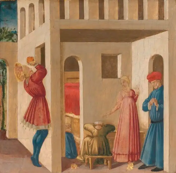 Ладно. Давайте приближаться к Санта-Клаусу. Ещё одна (если не главная) легенда о Николае – это "Спасение трёх девиц". О, это был средневековый хит! Он затрагивал какие-то важные струнки в душах и умах тогдашних людей. Его без конца изображали художники (видимо, поток заказов не ослабевал). Давайте сперва посмотрим...